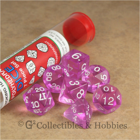These dice are a a see-through orchid color with white numbers. Each measures roughly 16 to 20mm tall (depending on the particular die). This set comes in a plastic tube with a removable cap.